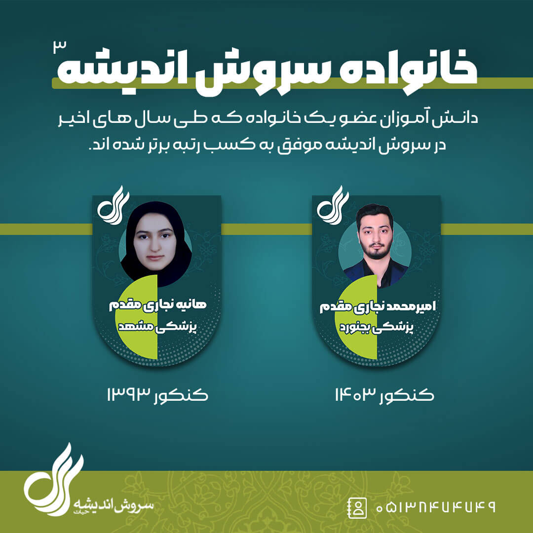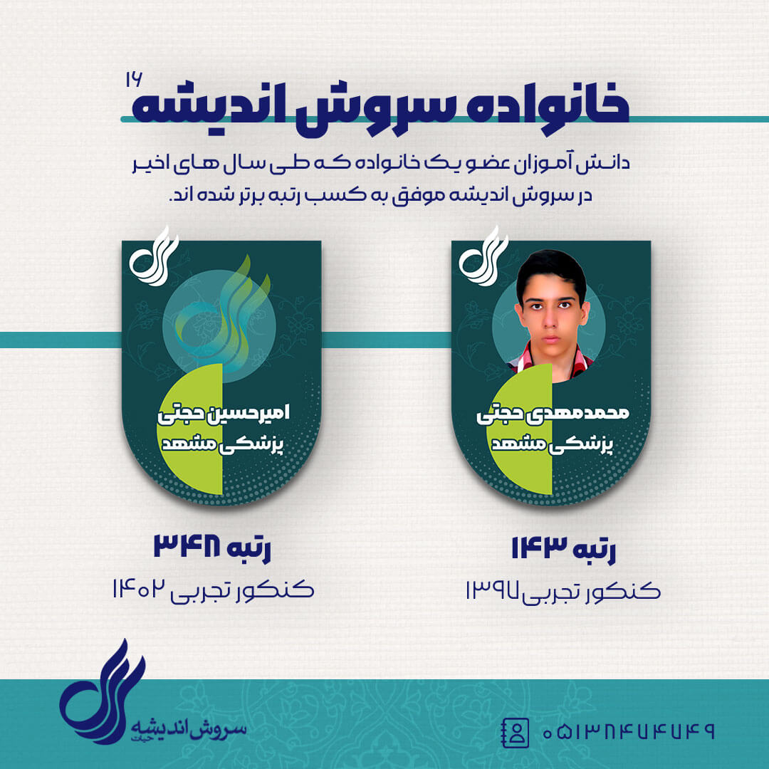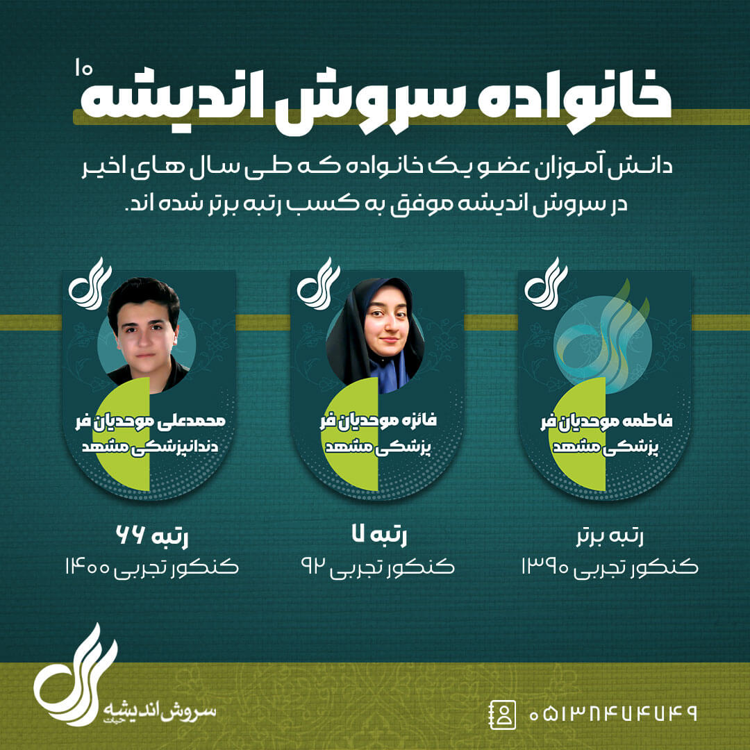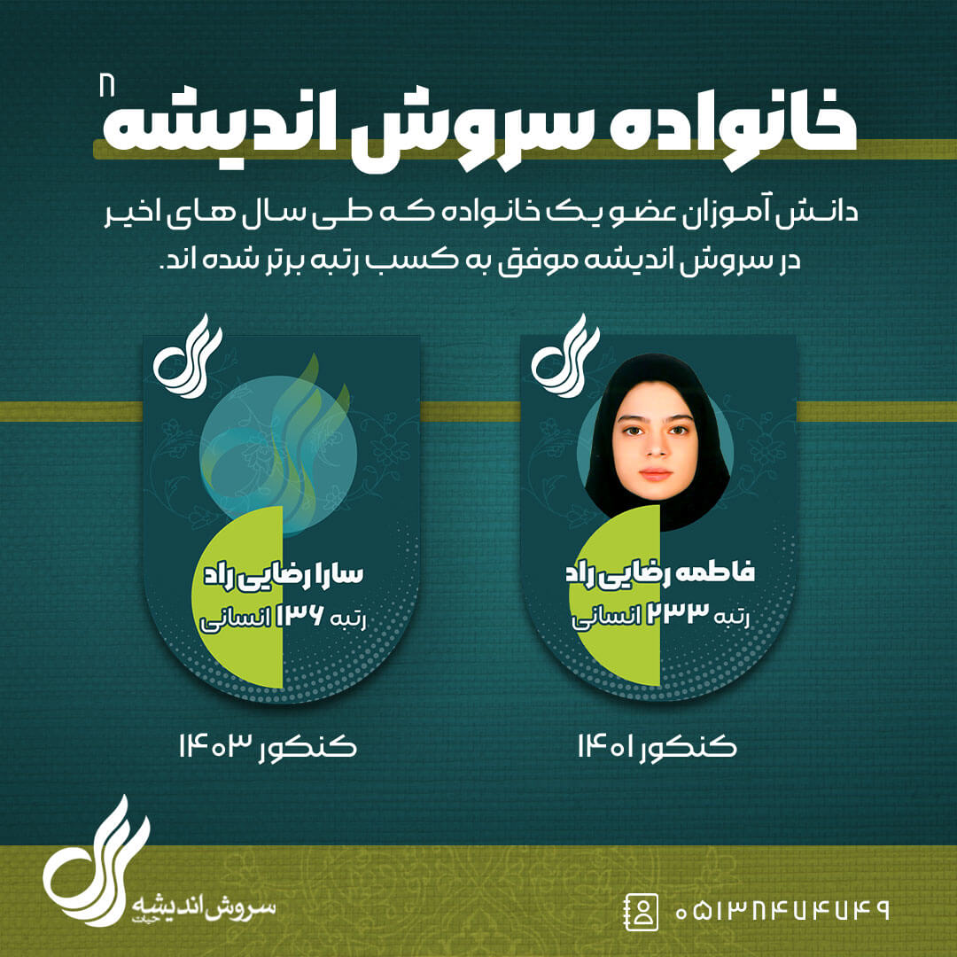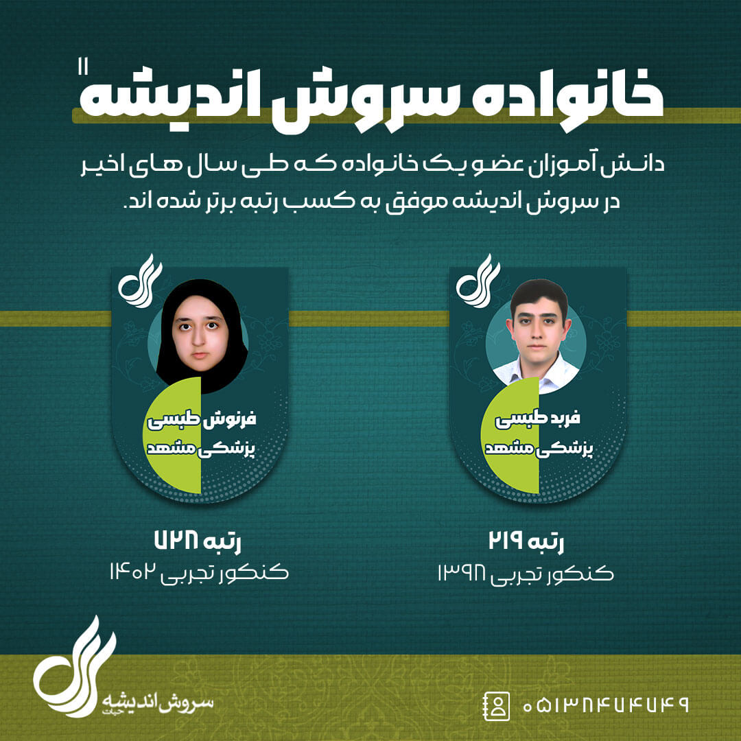 گاهی موفقیت فقط یک اتفاق فردی نیست . بلکه تبدیل به یک جریان خانوادگی می شود. طی 24 سال فعالیت سروش اندیشه ما بارها شاهد بودیم که نه تنها یک دانش آموز بلکه دو یا سه عضو یک خانواده با استفاده از برنامه ریزی و خدمات سروش اندیشه توانسته اند به رتبه برتر کنکور دست پیدا کنند. این موفقیت های خانوادگی برای ما ارزش دوچندان دارد زیرا نشان می دهد زمانی که اعتماد و پیگیری در یک خانواده نهادینه می شود، نتیجه ای شگفت انگیز رقم می زند.