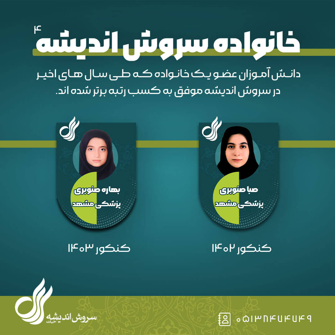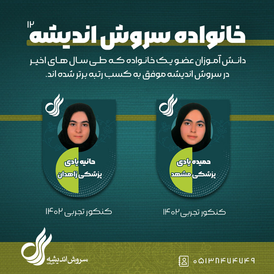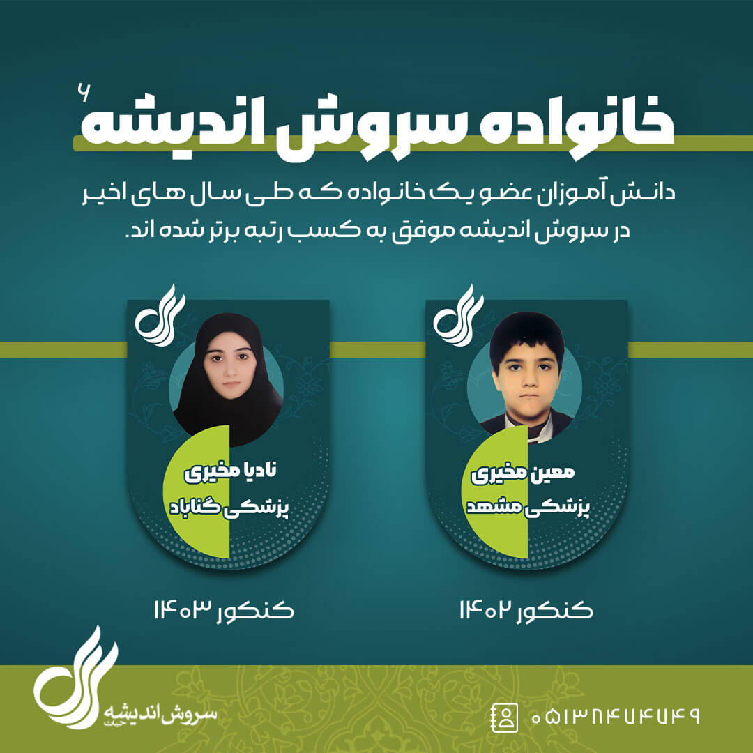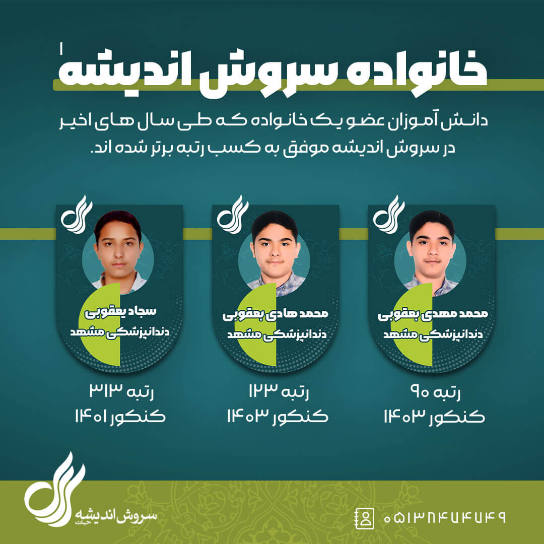 گاهی موفقیت فقط یک اتفاق فردی نیست . بلکه تبدیل به یک جریان خانوادگی می شود. طی 24 سال فعالیت سروش اندیشه ما بارها شاهد بودیم که نه تنها یک دانش آموز بلکه دو یا سه عضو یک خانواده با استفاده از برنامه ریزی و خدمات سروش اندیشه توانسته اند به رتبه برتر کنکور دست پیدا کنند. این موفقیت های خانوادگی برای ما ارزش دوچندان دارد زیرا نشان می دهد زمانی که اعتماد و پیگیری در یک خانواده نهادینه می شود، نتیجه ای شگفت انگیز رقم می زند.