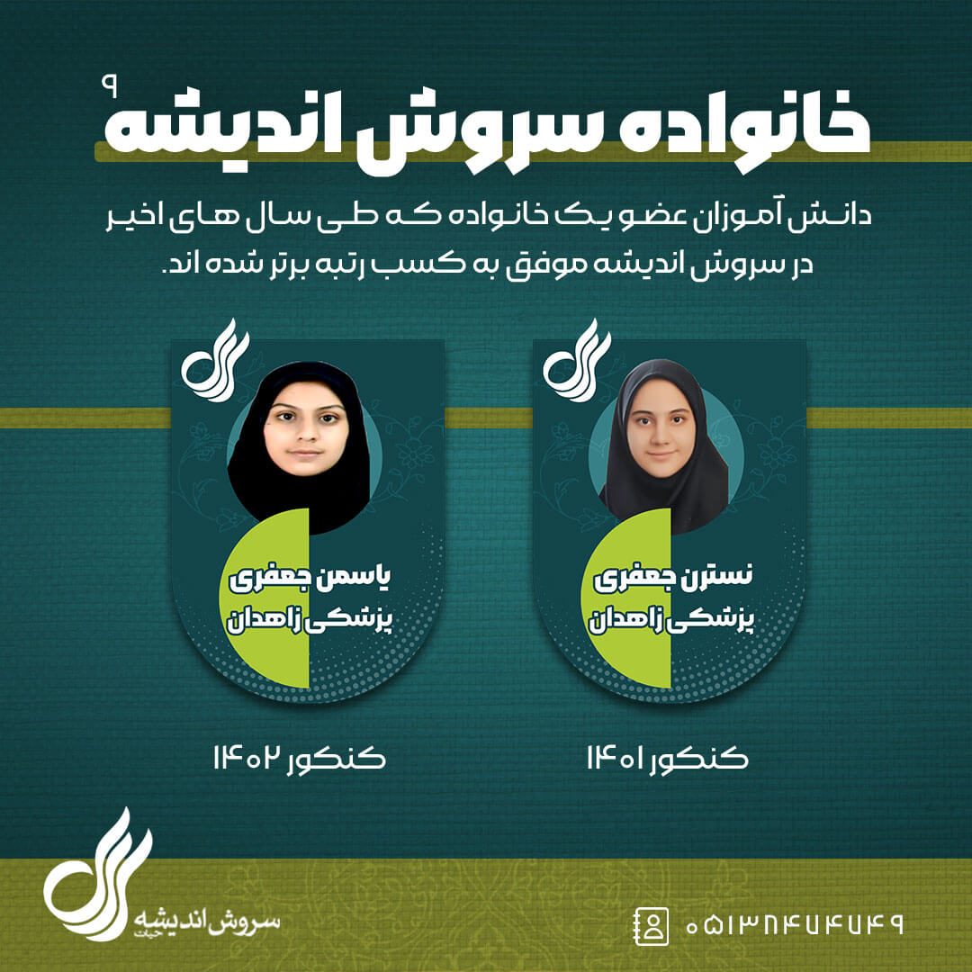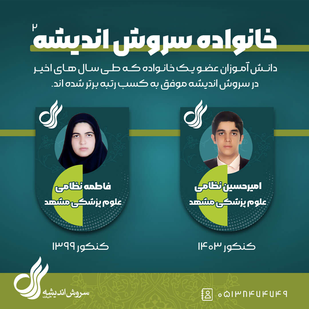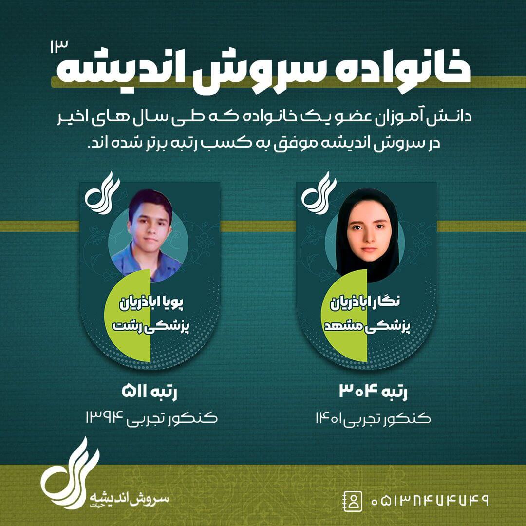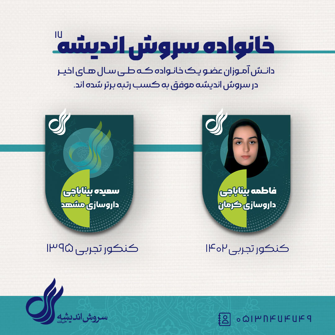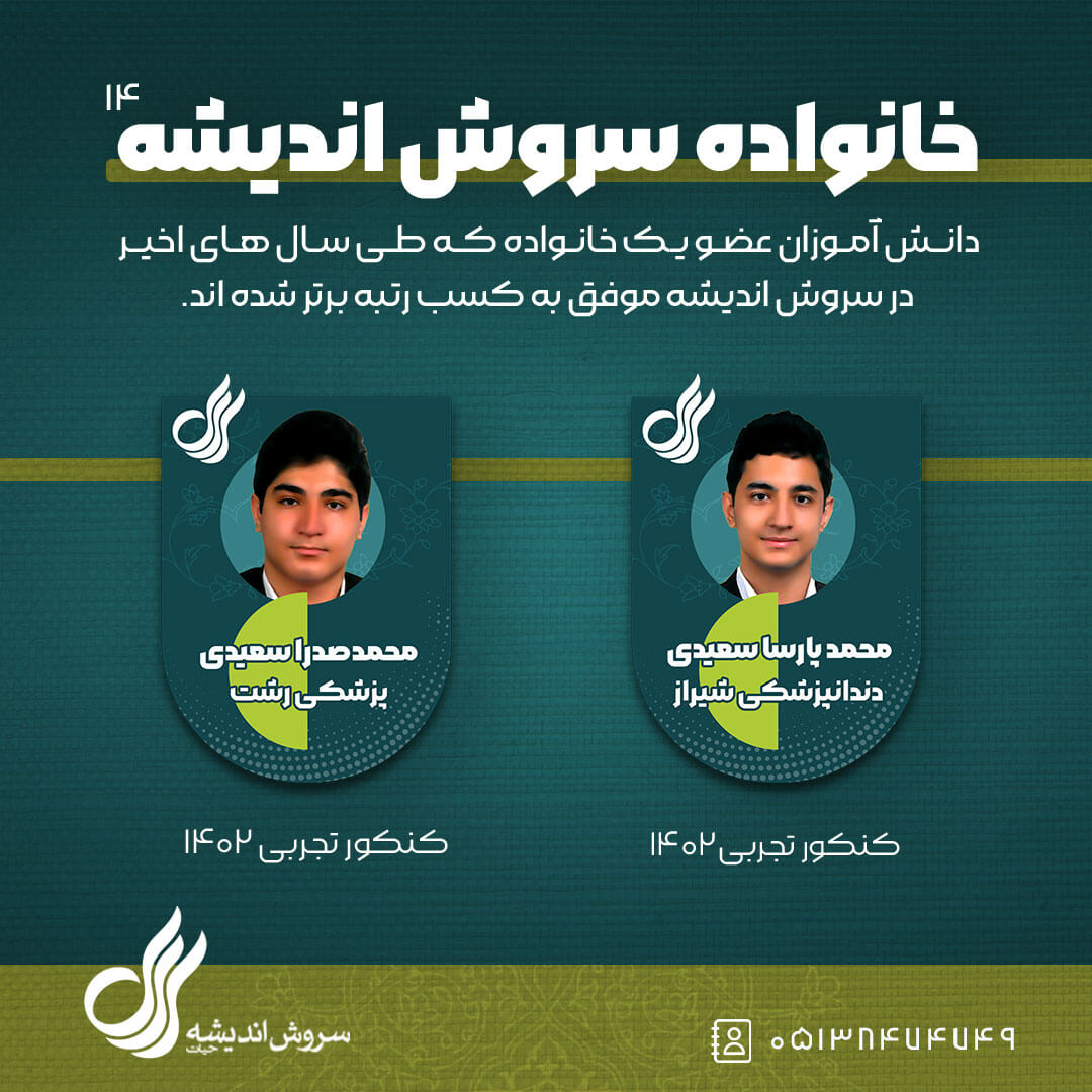 گاهی موفقیت فقط یک اتفاق فردی نیست . بلکه تبدیل به یک جریان خانوادگی می شود. طی 24 سال فعالیت سروش اندیشه ما بارها شاهد بودیم که نه تنها یک دانش آموز بلکه دو یا سه عضو یک خانواده با استفاده از برنامه ریزی و خدمات سروش اندیشه توانسته اند به رتبه برتر کنکور دست پیدا کنند. این موفقیت های خانوادگی برای ما ارزش دوچندان دارد زیرا نشان می دهد زمانی که اعتماد و پیگیری در یک خانواده نهادینه می شود، نتیجه ای شگفت انگیز رقم می زند.
